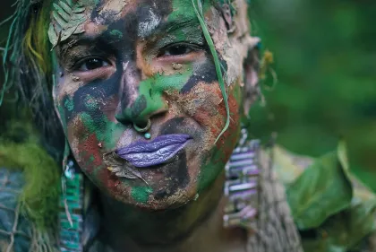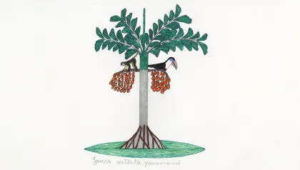 oseca is a Yanomami artist who lives in the Amazon rainforest, Brazil, between the states of Amazonas and Roraima. His drawings combine images of shamanic spirits with scenes from daily forest life, showing the importance of trees and their spirits in the life-giving forest ecosystem and the Yanomami belief system.