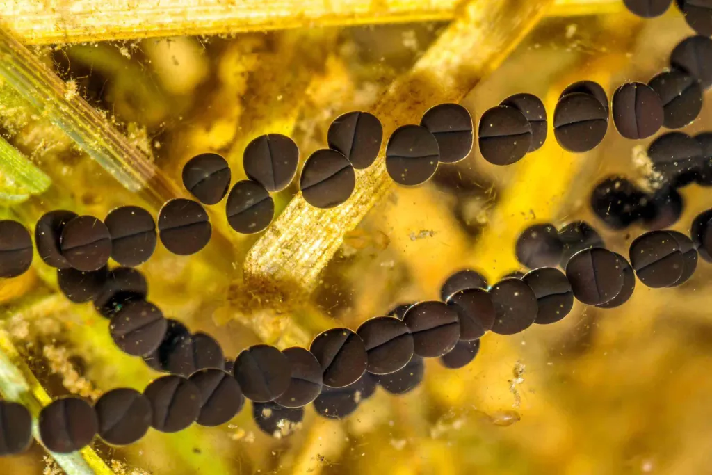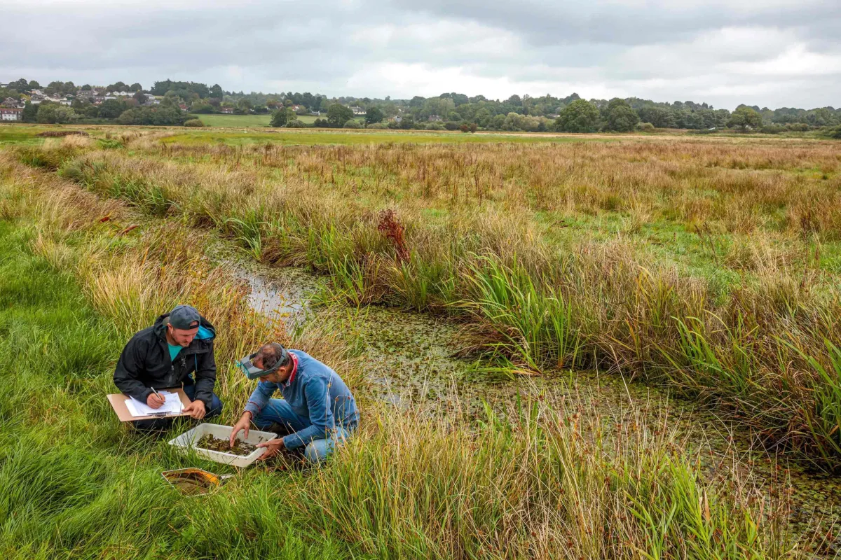 A little whirlpool ramshorn snail (Anisus vorticulus). (opening image) / Surveying the population of little whirlpool ramshorn snails (Anisus vorticulus). / The 5mm snails can only be found in Pulborough Brooks RSPB Reserve, West Sussex, UK.