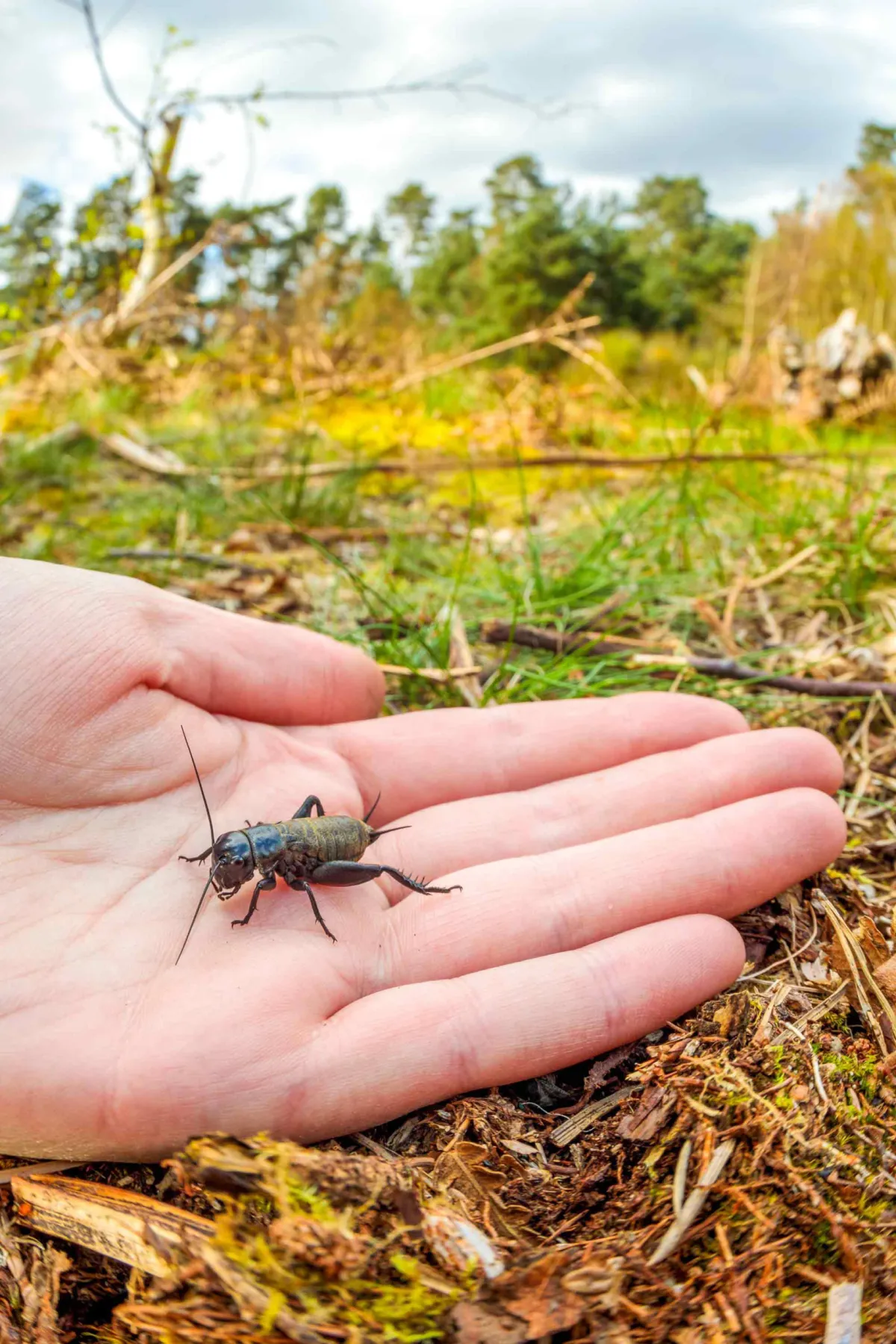 Field Cricket (Gryllus campestris) nymph being translocated to a new site in Surrey.