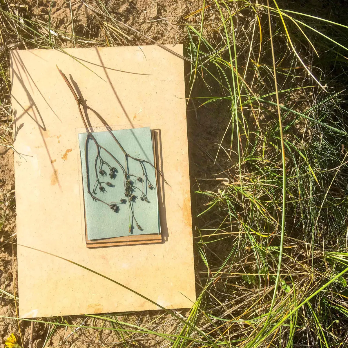 Processing cyanotypes in the sun on the dunes. / Completed cyanotypes after a day out in the dunes.