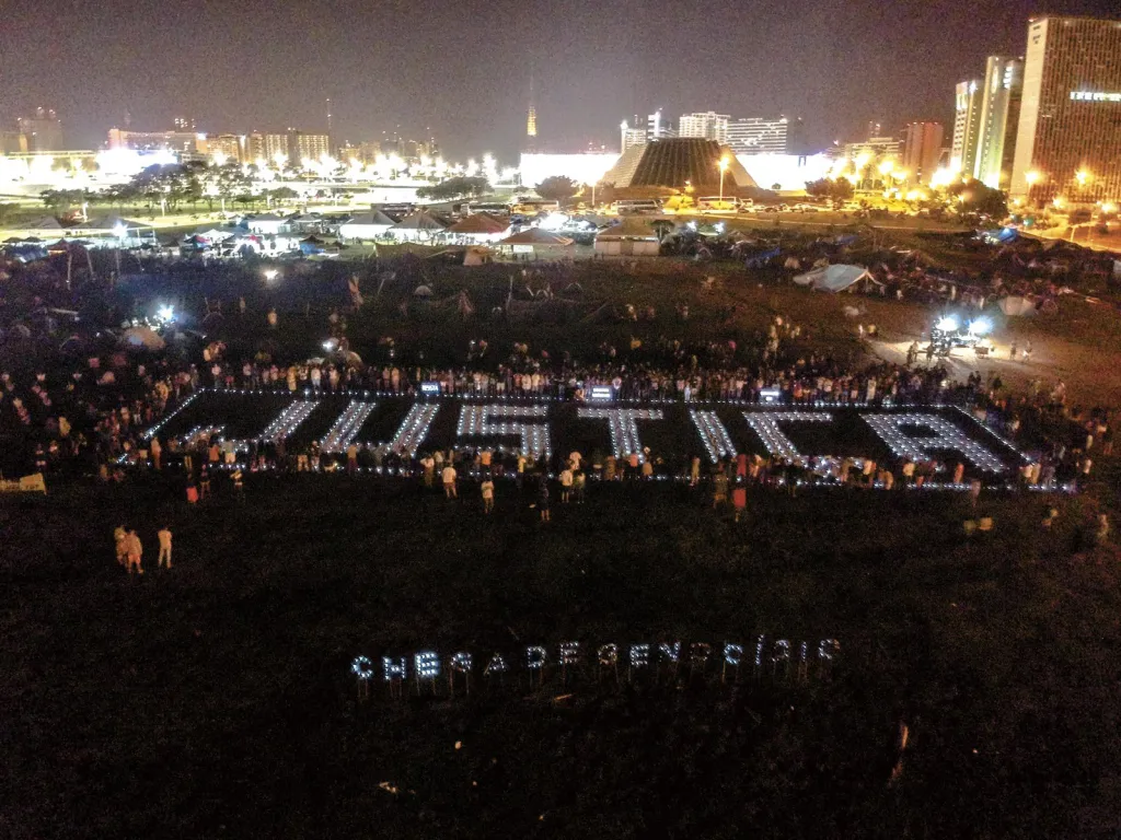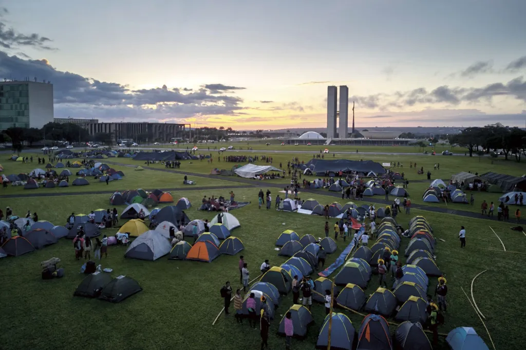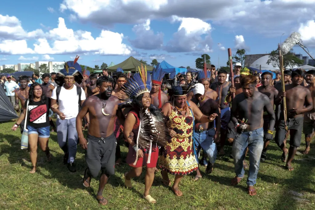SÔNIA GUAJAJARA AMONG OTHER INDIGENOUS LEADERS AT THE CAMP.