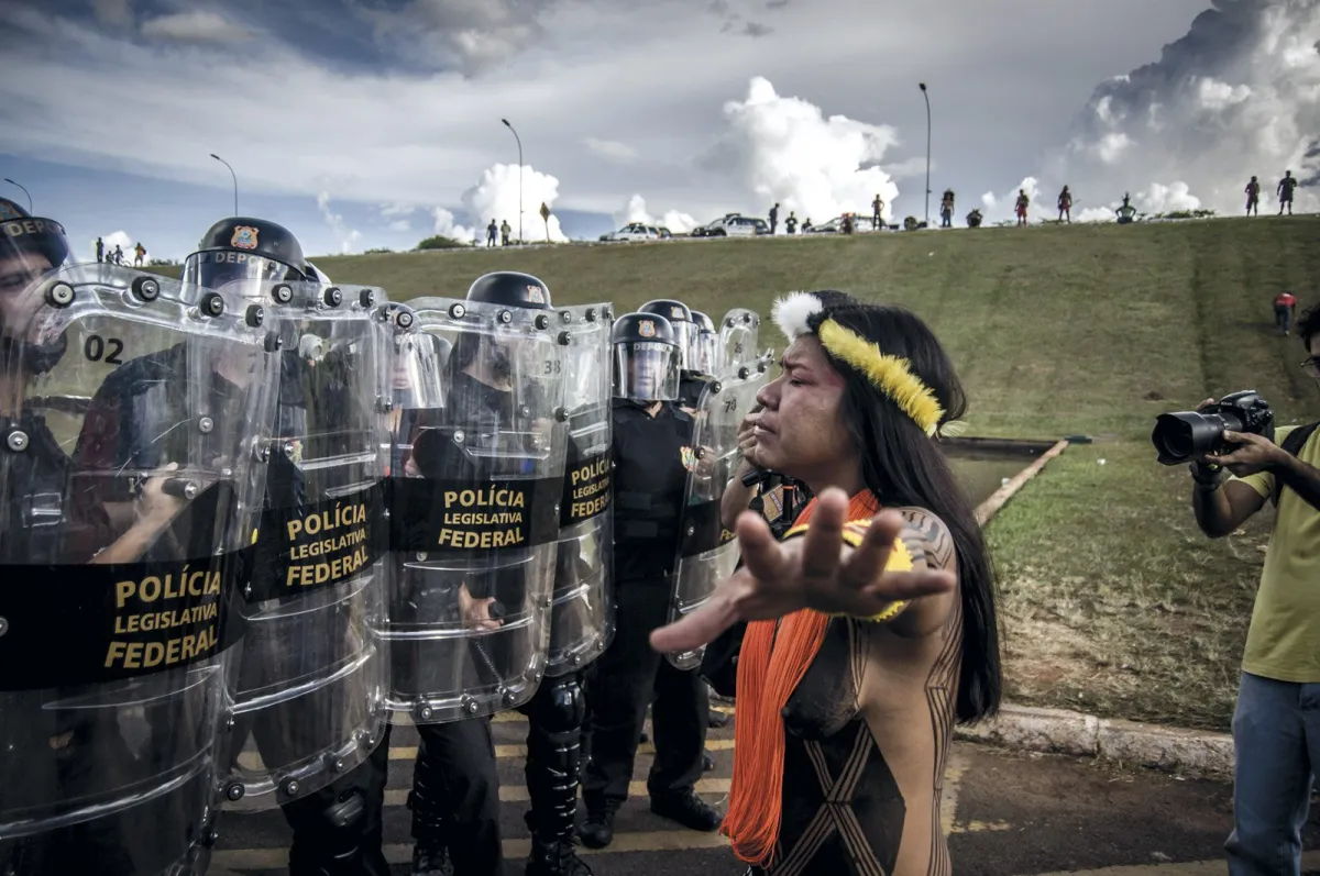A DEMONSTRATOR FACES OFF IN FRONT OF THE POLICE AT THE 2017 ACAMPAMENTO TERRA LIVRE.