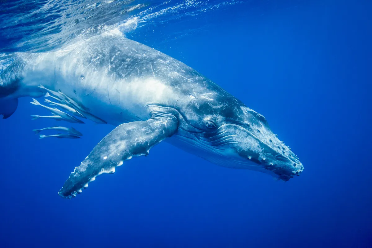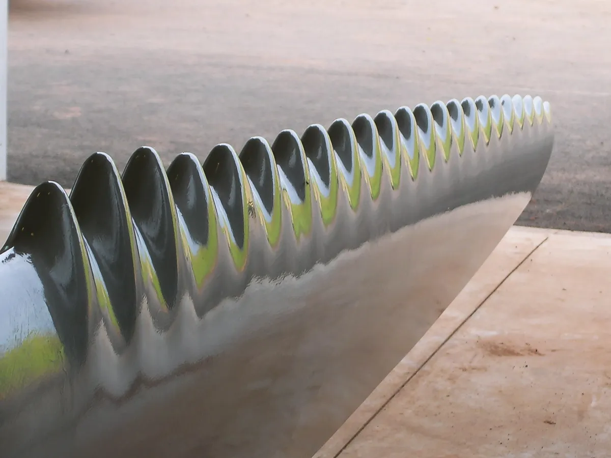 A WhalePower wind turbine blade inspired by the tubercles found on the flippers of humpback whales. Photographs courtesy WhalePower Corporation (left) and Culture Creative / alamy Stock Photo (right).