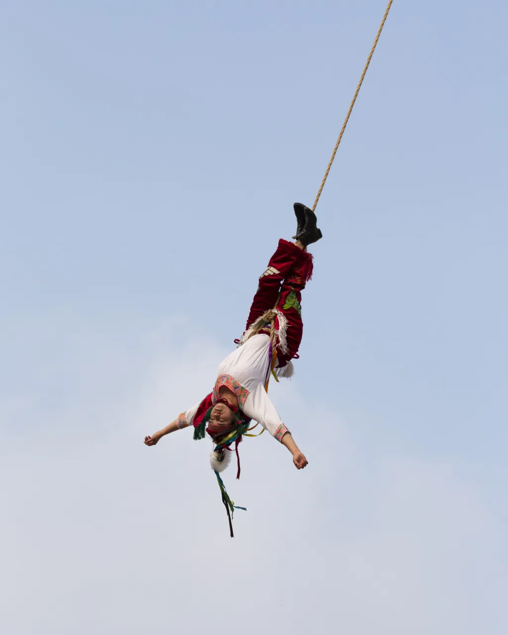 Cuetzalan del Progreso is home to a large Indigenous population, primarily Nahua and Totonac people, and the flying dance has been practised there for centuries. “It’s difficult to tell where the [flying] dance first originated,” Irene, one participant, tells the Guardian, “I personally think the tradition… was born in different parts of Mexico at the same time.” But it is clear that the dance, and its significance has changed over time. In pre-colonial times, as the Guardian explains, it “was performed as a way to communicate with the gods and ask for a good harvest. After the arrival of Spanish colonisers, the dance was reimagined as a tribute to Catholic saints during religious festivities.” A few years ago, Luongo became intrigued by the presence of women taking part in the dance - many of whom have faced pushback for doing so, either because their participation is untraditional or because of the physical risk involved. Shebegan asking around. “I was introduced to some voladoras, we talked about the possibility of working on this project and they really liked the idea,” she says. “It took me a few years to properly start working on the project but I eventually managed to get funding and at the beginning of 2022 I returned to Cuetzalan” to photograph.”