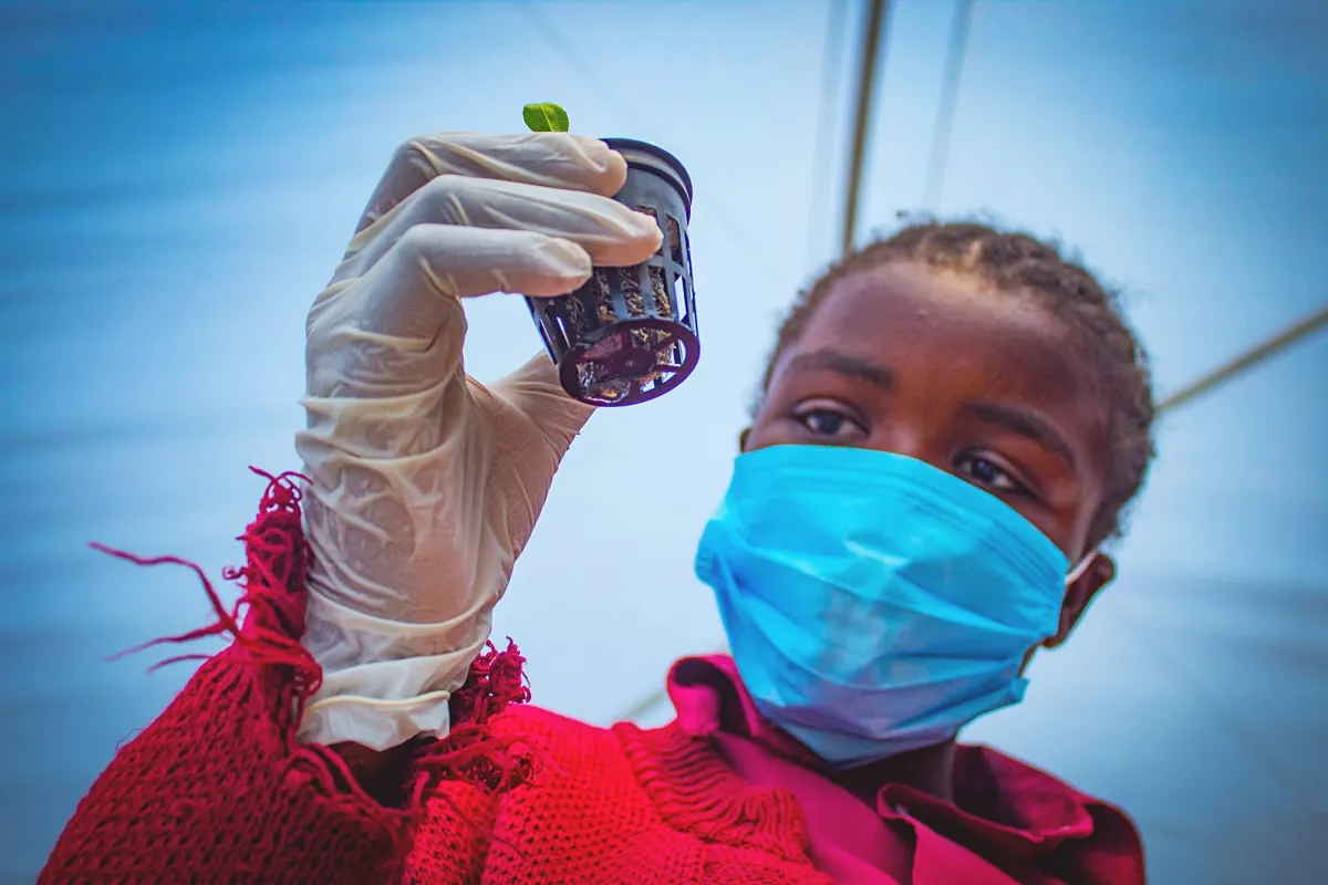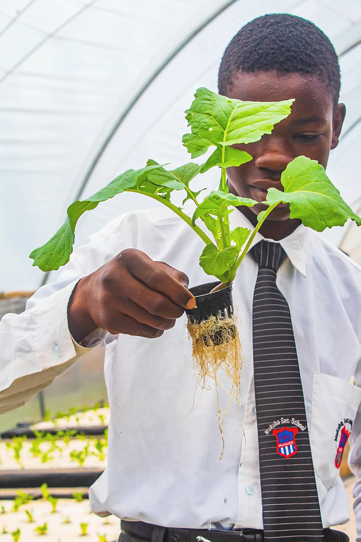 When the Zambian government first started providing food for the school feeding programme, students were only receiving maize. The hydroponic and grain bag systems have allowed schools to grow vegetables all year round, guaranteeing fresh and nutritious meals. Student Joe Chisanga says: “Before we set up this site, I didn’t think it was possible to grow plants without soil. This has proven to me that it is possible.’’ Photograph by Sophie Smeulders and Paul M boshya Jr.