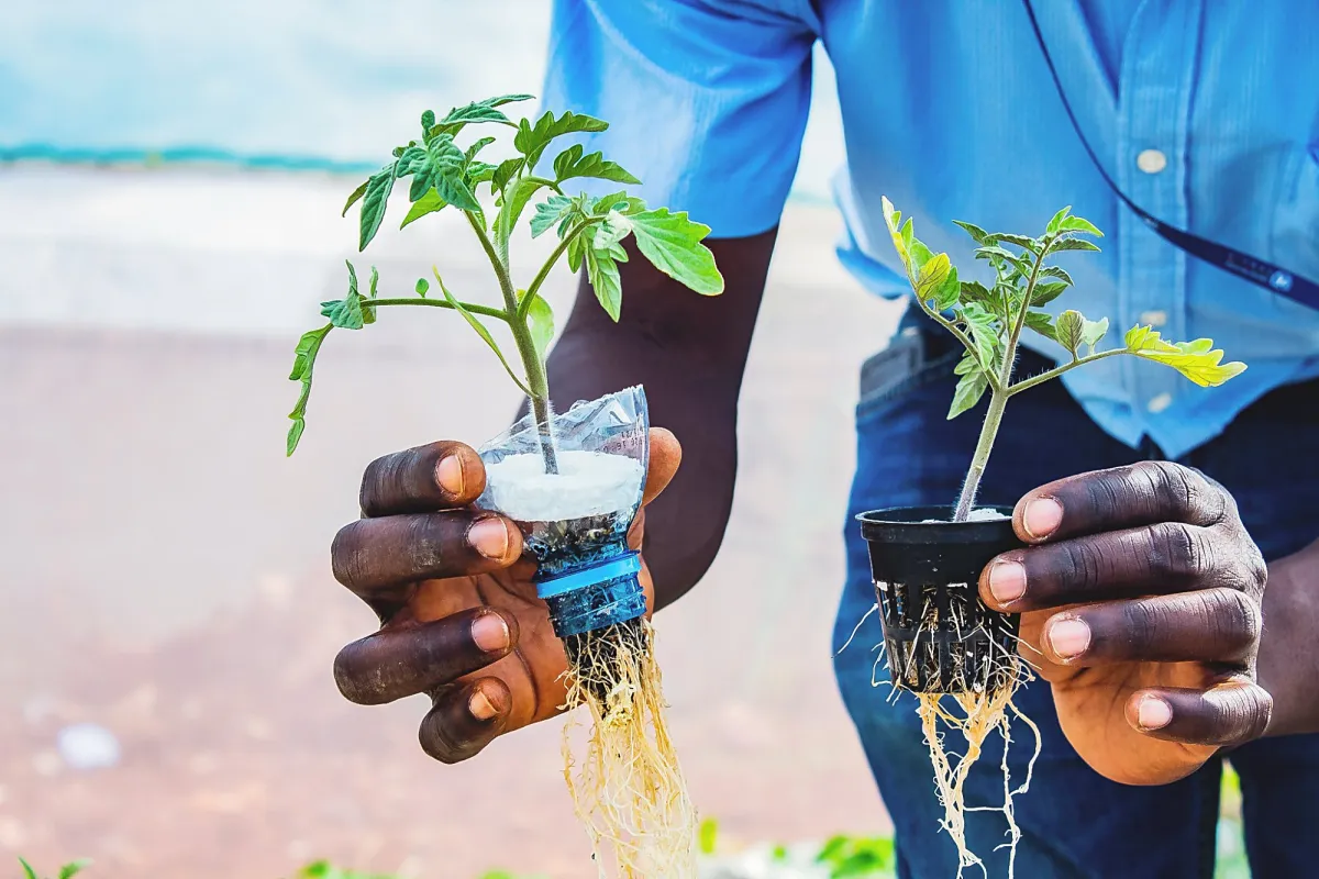Bags are placed on a plastic surface that means the grass can’t get into the bag and whatever is on the ground does not have access to the bag. The bags are placed in greenhouses so they do not dry out. The watering in the bag is minimal, perhaps twice a week. In this system, we are able to plant anything, including tubers like carrots, fruit, and other heavy plants like eggplants. The time for maturity is comparable to hydroponics, and it’s also smart agriculture.