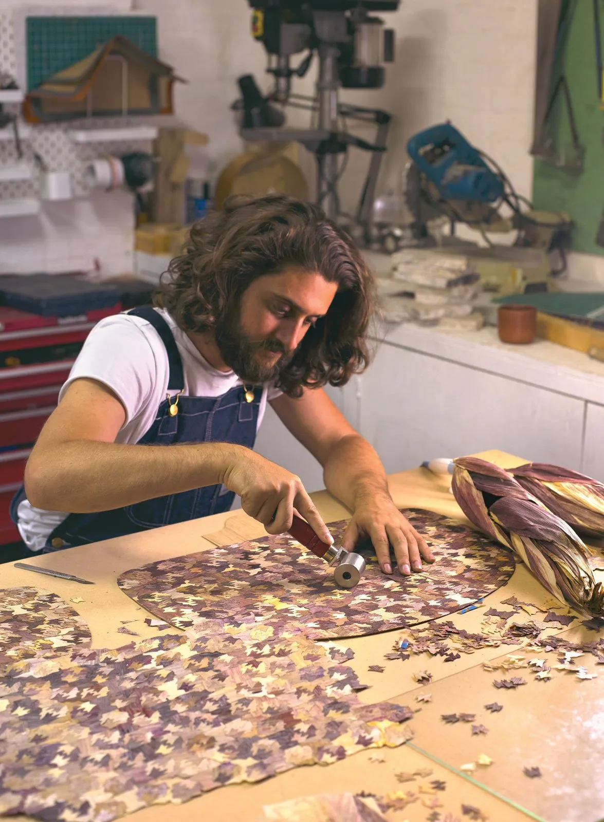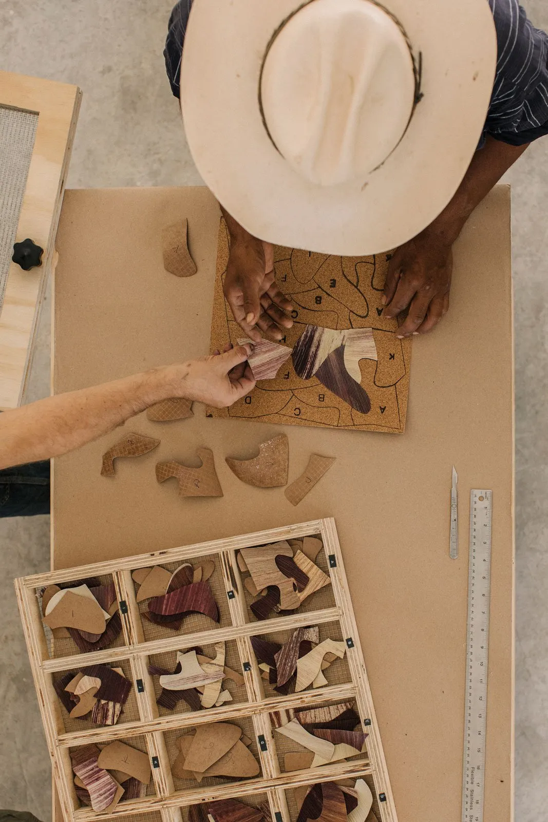 Fernando Laposse crafting marquetry with the Totomoxtle veneer. A tabletop detail. PhotoGRAPHs courtesy Fernando Laposse.