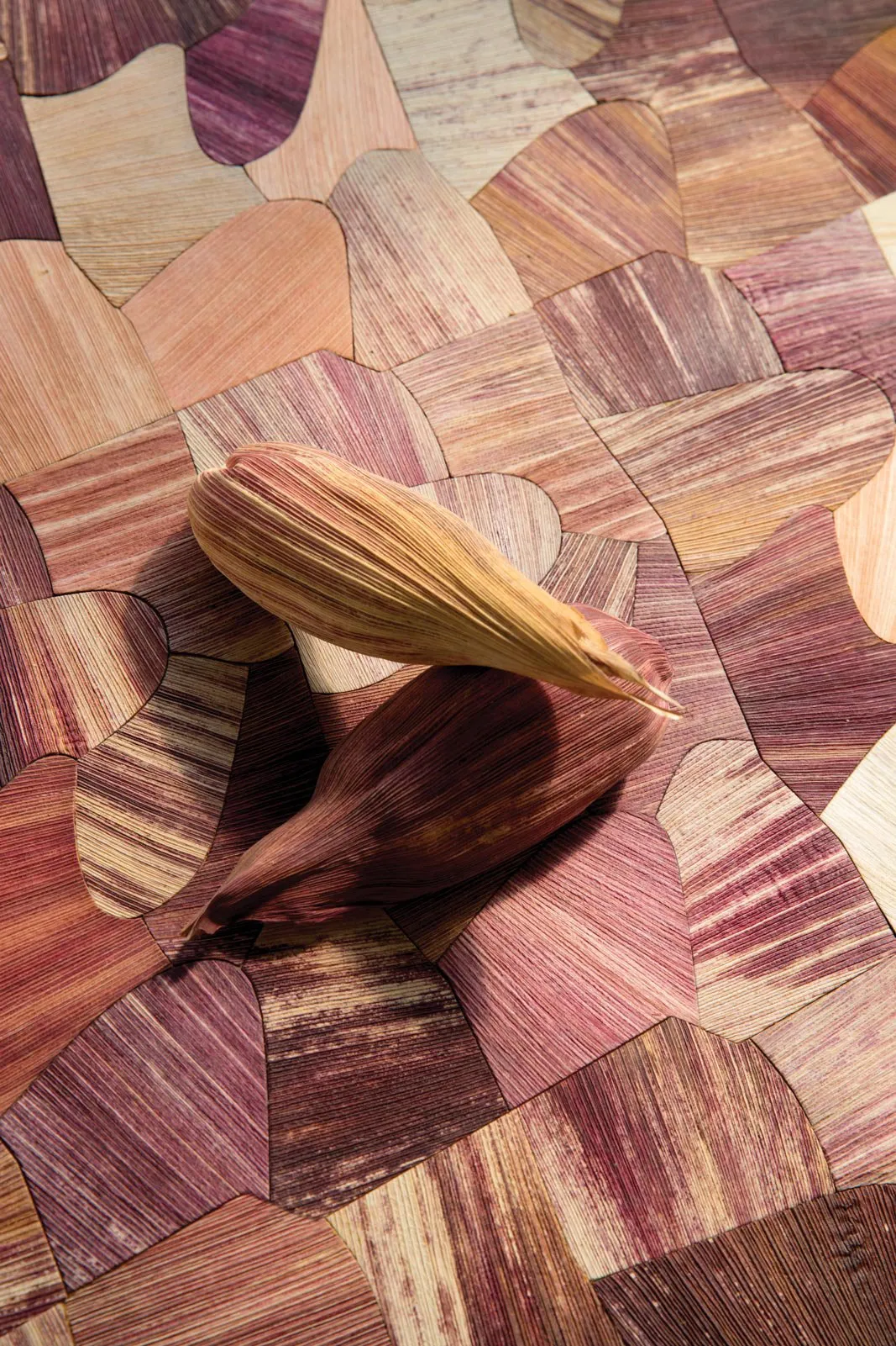 Totomoxtle is a veneer made with the husks of endangered Mexican heirloom corn. An important aspect of the project is the regeneration of traditional agricultural practices, alongside the creation of a new craft that generates income for the Mixtec farmers and herders in the state of Puebla, Mexico. Fernando has been working with a group of families from there since 2016 and with the support of the International Maize and Wheat Improvement Center, the world’s largest corn seed bank, they have been slowly reintroducing native seeds. PhotoGRAPH courtesy Fernando Laposse.