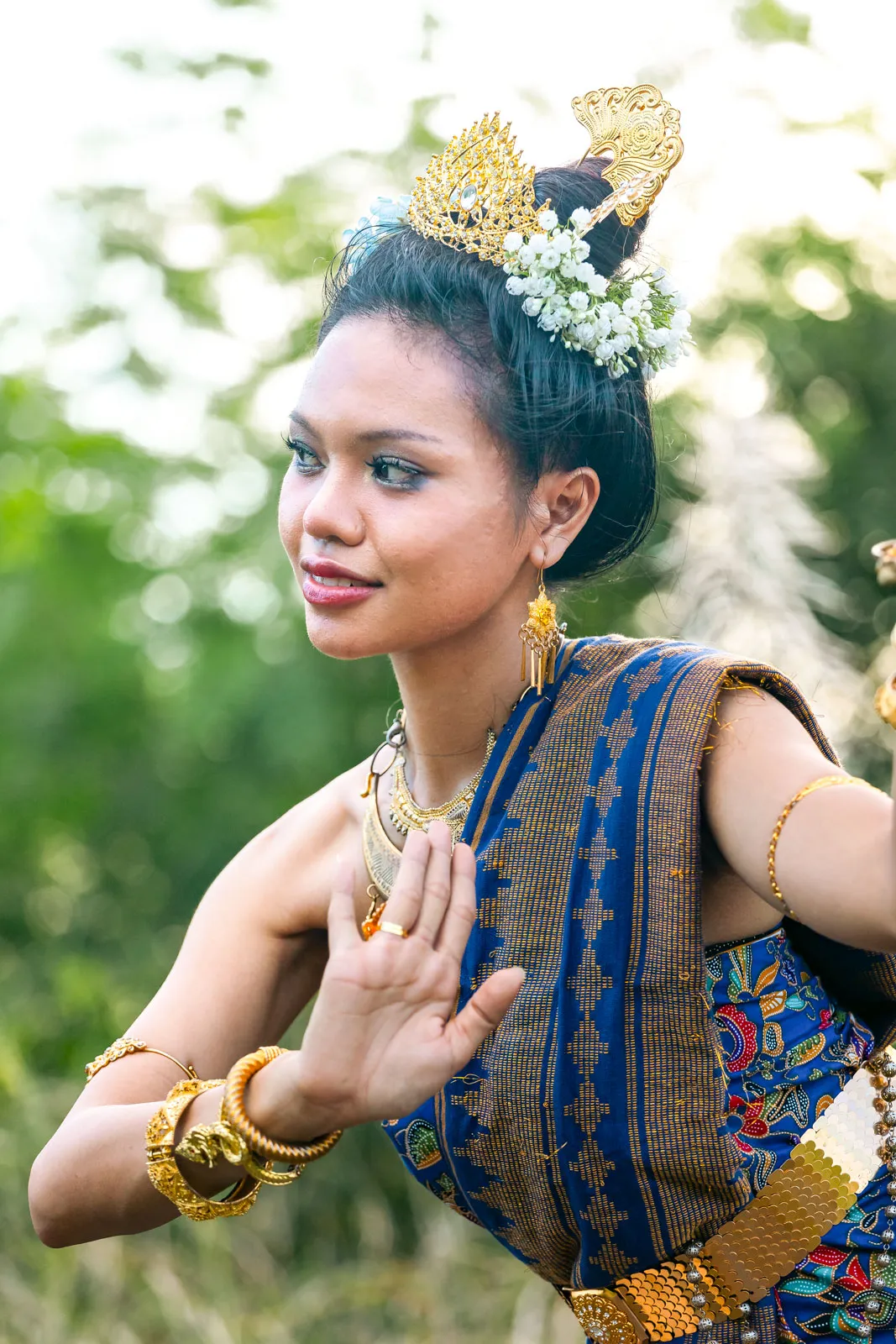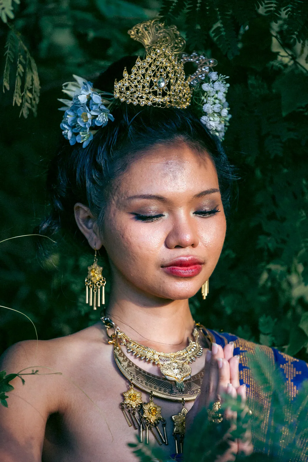 Sharrie Villaver, 24, is dressed differently - but somehow, similarly - to her sister. She is wrapped in a deep blue batik (wax-dyed) tapis, with a bakus (belt) cinching her waist and a trio of hair ornaments: a tusuk (golden comb), a pudung-pudung (golden crown), and lavender tagunbaisat (flower headpiece). Standing amidst the coming and going of the store crowd, her chin slightly jutted out as if issuing a challenge, she waves back.