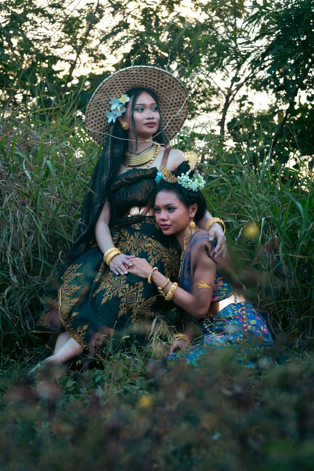Minxie Villaver, 28, arrives in the parking lot of a supermarket on the back of a scooter. She is dressed in a black-and-gold tapis (a tubular wrap-around dress) cradling a saruk (a woven hat with a brim) on her lap. She removes her helmet and reveals a long alampay (shawl) on her head, with white flowers tucked and gleaming against the black cloth. Regal, even if slightly dishevelled from the commute, she waves to her sister, who is standing by the entrance to the store.