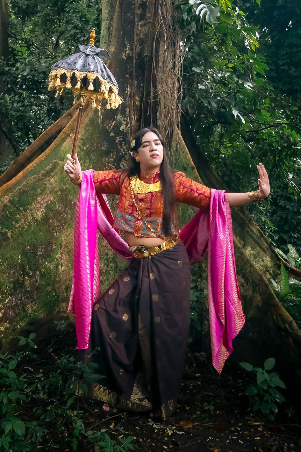 Nahia Lloren, 23, glides in her pink-and-red baru (blouse) across an arboretum at the University of the Philippines in Diliman, Quezon City - one of the few remaining urban green spaces in Metro Manila. Nahia grew up detached from her Visayan roots, spending most of her life in Manila and barely speaking Cebuano, one of the main native languages spoken in the Visayas. When she came across Sharrie’s popular social media post where Sharrie wore pre-colonial Visayan clothing, Nahia decided to join Karakoa on their voyage to learn the truth about their ancestors.