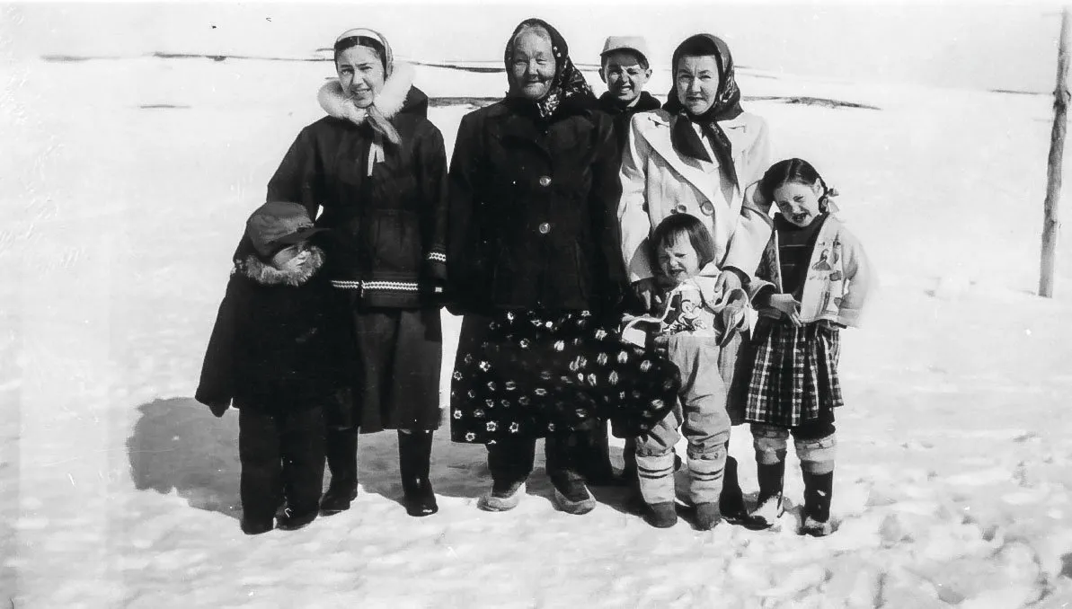 INUIT FAMILY, WITH SETTLEMENT IN BACKGROUND, POND INLET, ON NORTHERN BAFFIN ISLAND, C. 1945-1946. LIBRARY AND ARCHIVES CANADA/ARTHUR H. TWEEDLE FONDS/A186229.