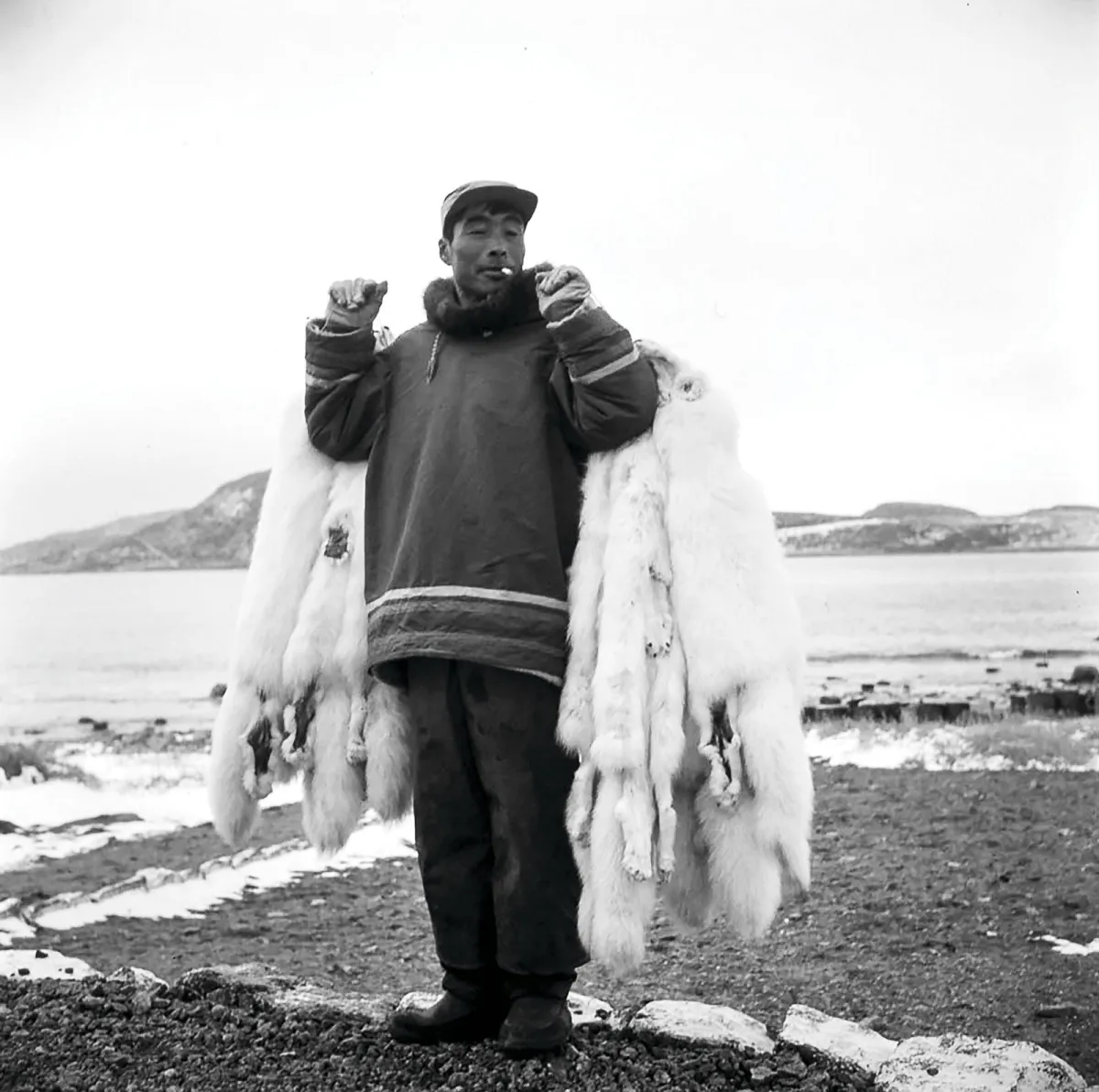 MAN CARRYING FOX PELTS, CAPE DORSET, NUNAVUT, BETWEEN JUNE-SEPTEMBER 1960. © LIBRARY AND ARCHIVES CANADA. REPRODUCED WITH THE PERMISSION OF LIBRARY AND ARCHIVES CANADA. LIBRARY AND ARCHIVES CANADA/ROSEMARY GILLIAT EATON FONDS/E010975435