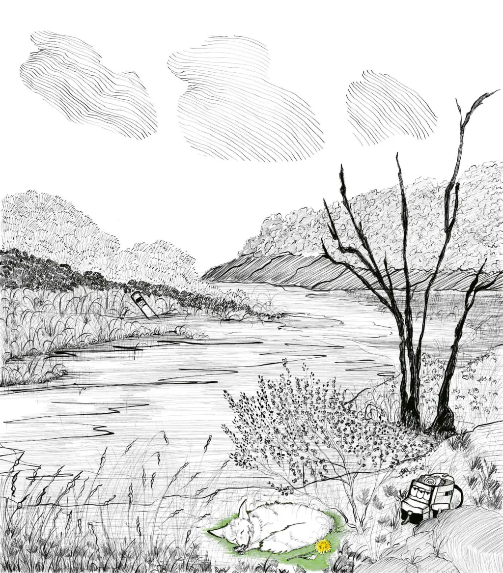 At first glance, I couldn’t tell if she was a dog or a coyote. Resting peacefully in the shade of a coyote brush plant, her long, grayish-brown torso was cradled by the wetland grasses of Muir Beach, a quiet lagoon in Marin County, California. Her left eye was half open, the whitish fur of her left big ear exposed to the sunlight, the bushy tail curled up like a caterpillar, hiding the hind legs. Her front legs looked as if they were gently placed, one on top of the other, reminding me of how a new mother swaddles her baby for sleep time. I went closer and looked for movement, a breath, a widening of the eyes, or a twitch of the tail. Nothing.
