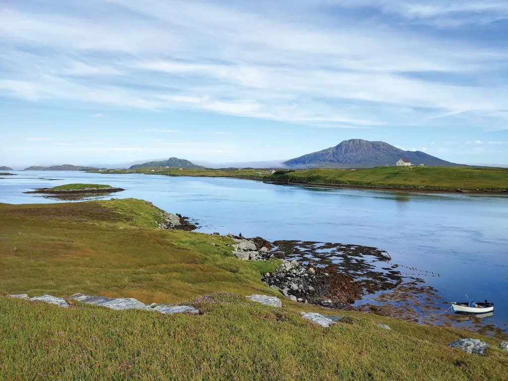 It’s late afternoon and the grey cloud that blanketed the sky this morning is now undetectable. I’m sitting at the helm of a small fishing boat, on Loch Euport, North Uist, as it casts a reflection in the mirrored stillness. Sam Cooke sings “You Send Me”, booming through a speaker over the loch, as Alexander Thompson-Byer steers the motor, guiding us smoothly across the water.
