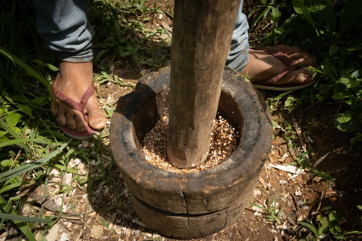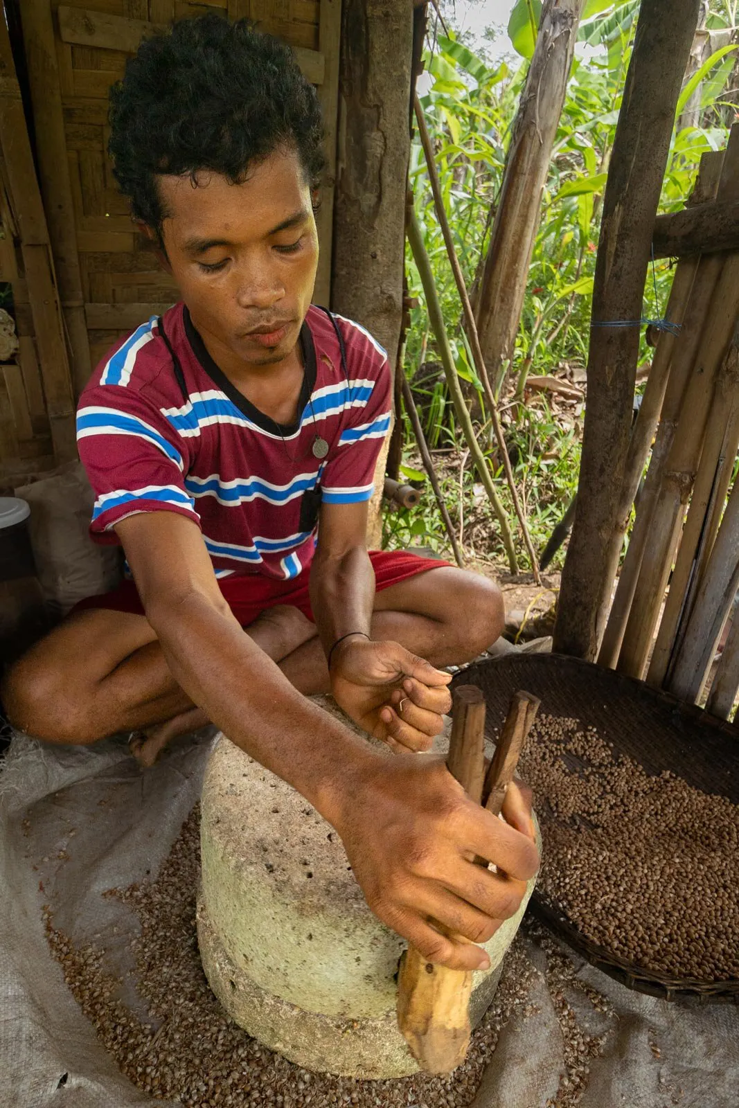 RANEL DEMONSTRATES A TRADITIONAL IMPLEMENT CALLED GALINGAN TO BATU WHICH TRANSLATES AS “STONE MILL”. HERE, HE MILLS ADLAI, A STAPLE FOOD CROP OF THE MANOBO.