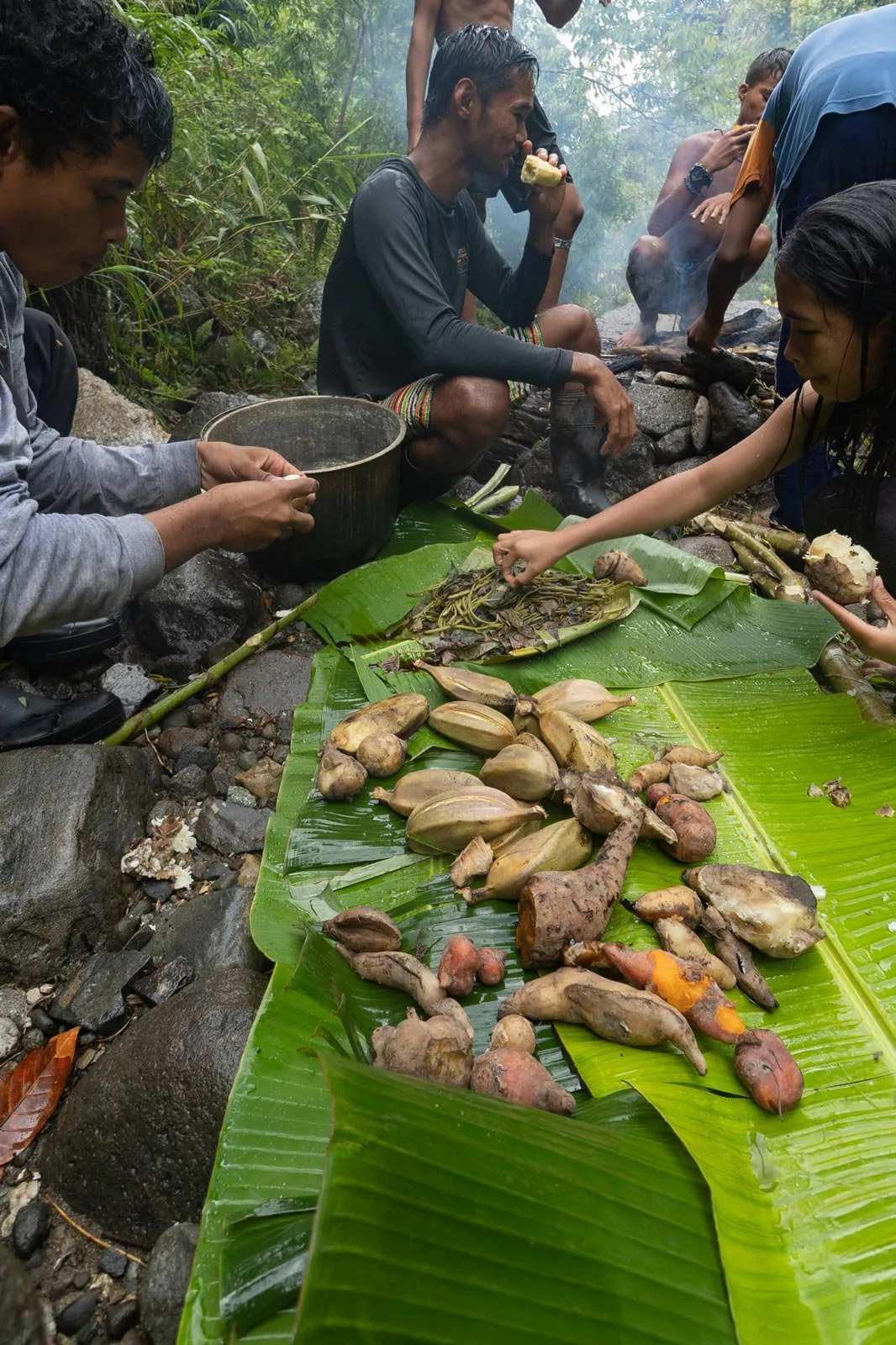 Soon after, they trekked higher upstream into a natural pool where they bathed and had lunch together. The meal consisted of root crops and foraged plants, laid out on a banana leaf.