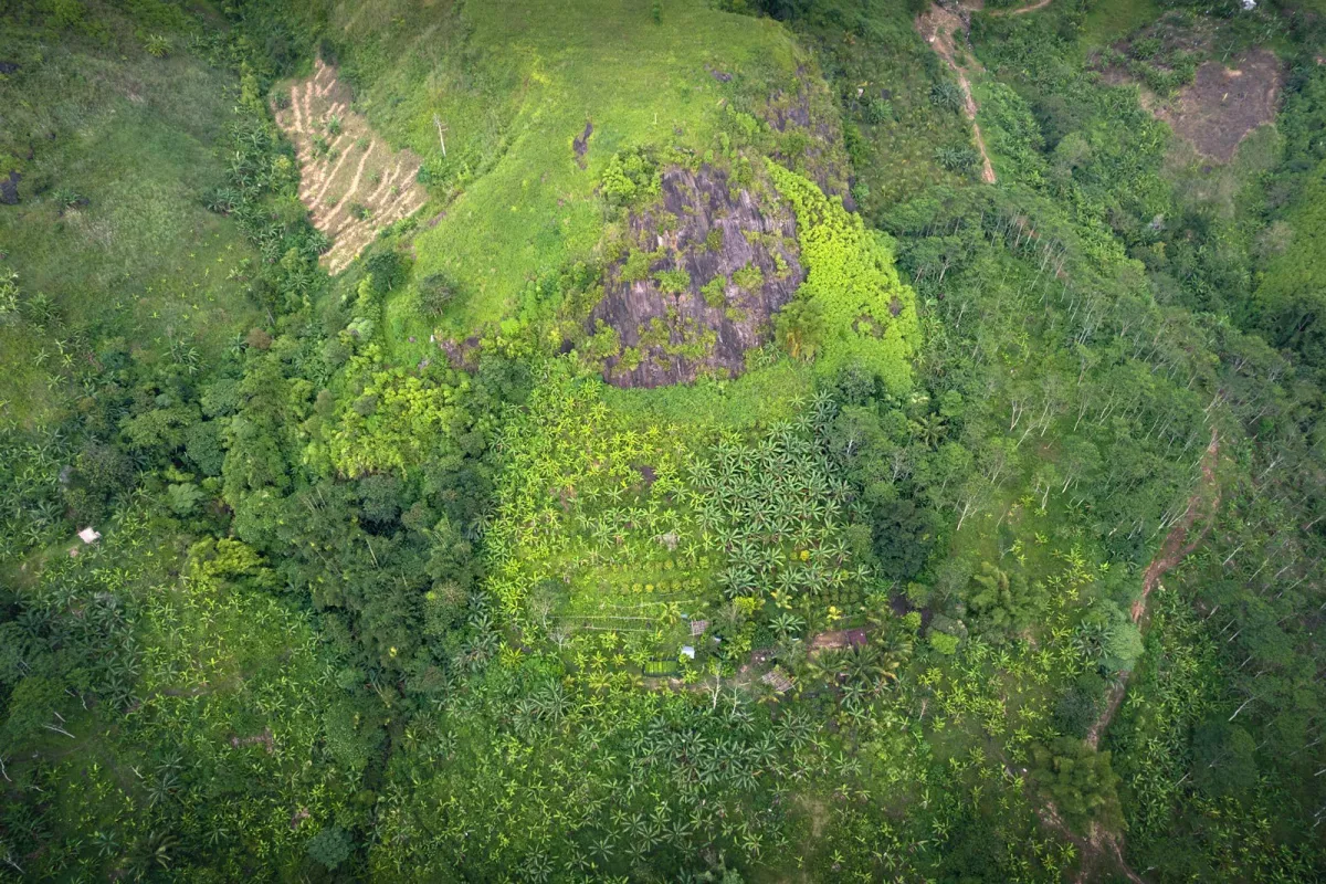 AN AERIAL VIEW OF RANEL MANGGATAWAN’S LAND. HERE, HE INCORPORATES THE MANOBO’S TRADITIONAL AGROECOLOGY, GROWING A DIVERSE HOST OF FOOD CROPS ALONG WITH NATIVE TREES.