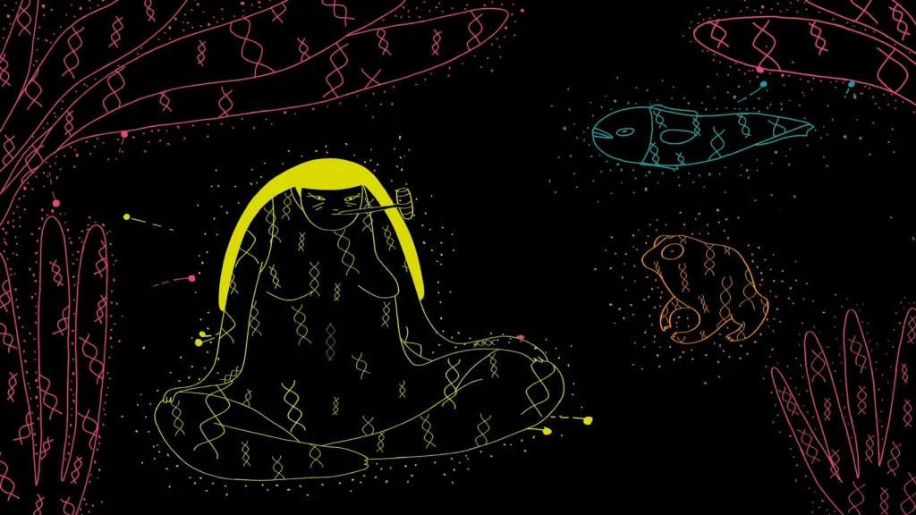 This technique of switching scales is part of the Wild Arrows’ attempt to forge connections between Indigenous narratives and western scientific thought. The first film, The Serpent and the Canoe, weaves together the stories of the snake canoe (a memory originating from the Rio Negro peoples) and the cosmic serpent (a motif found in the origin myths of many different cultures). Together, the parallel snake-stories resemble the double helix structure of DNA strands, prompting an understanding of DNA as a form of ancestral memory encoded into the bodies of human beings and other species alike.