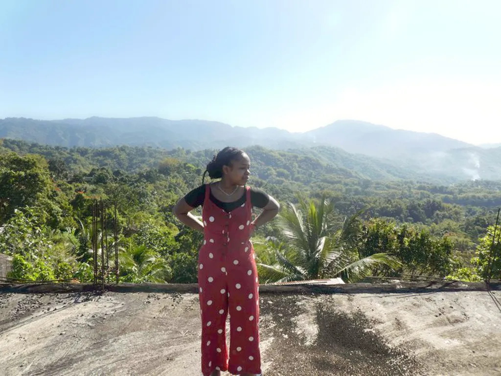 At my grandma’s house nestled in the mountains in Jamaica, sitting on her roof drinking coffee.